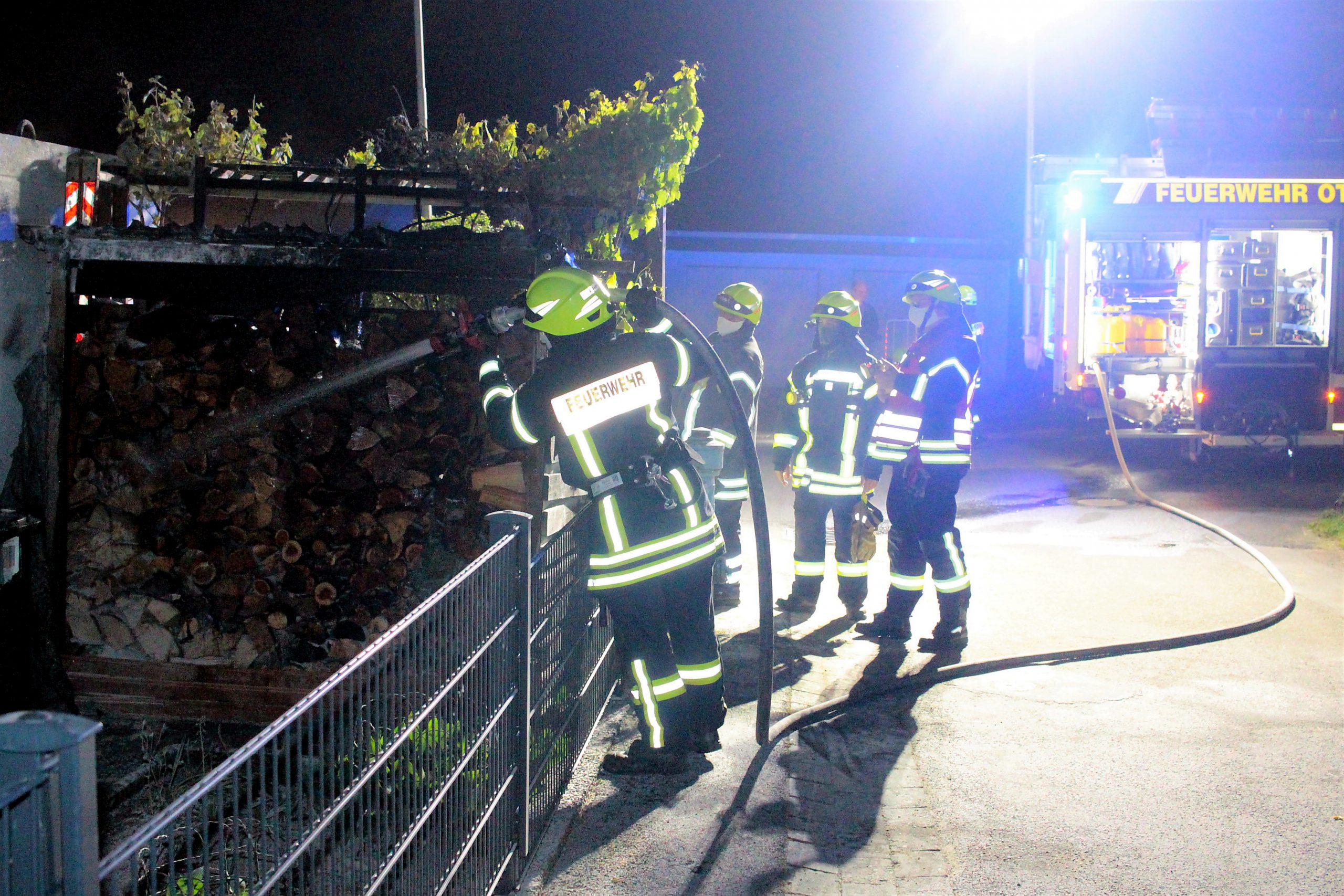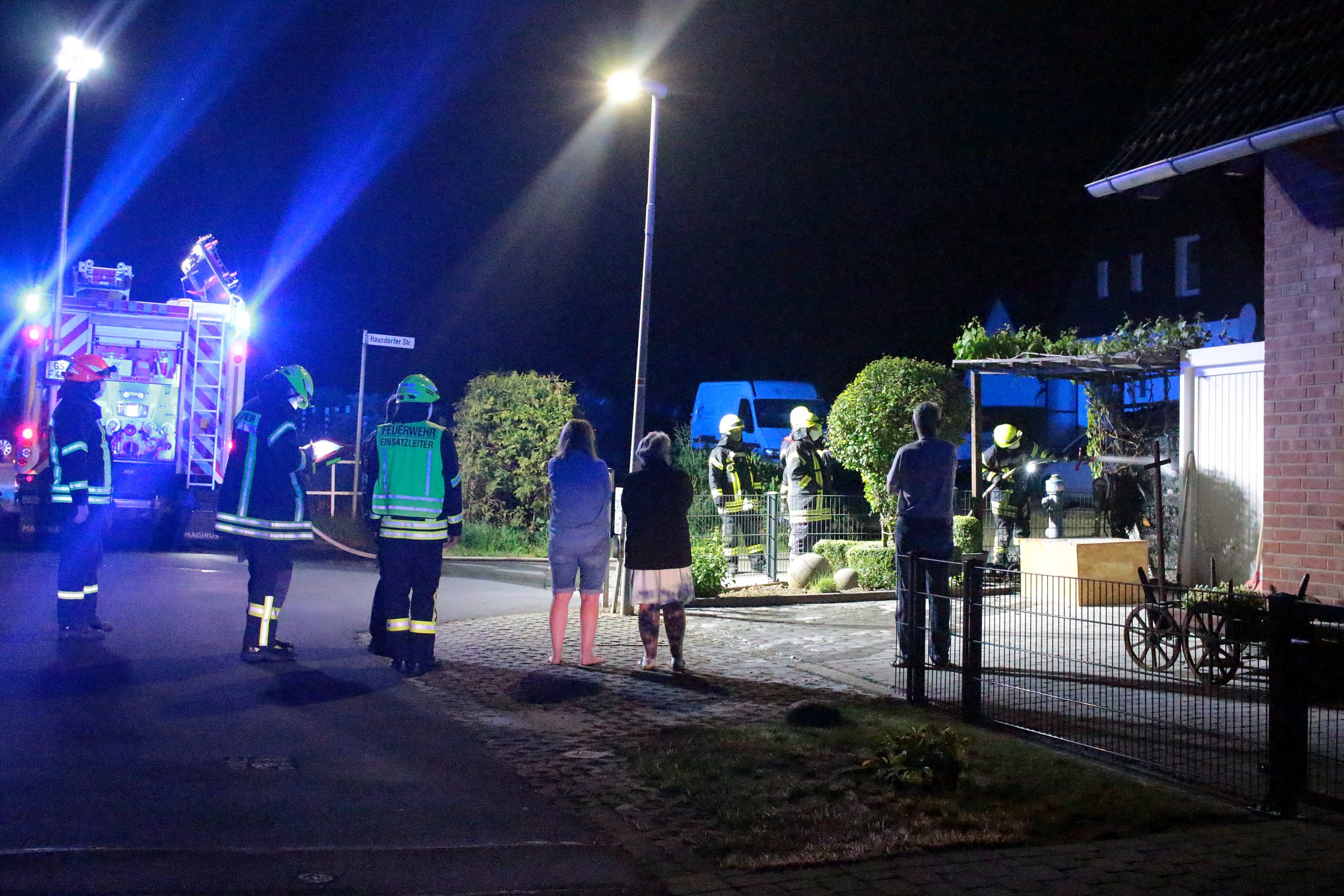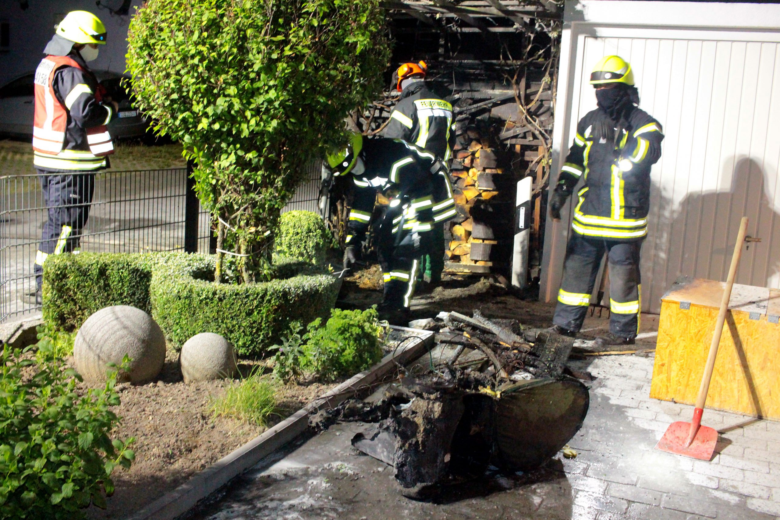 In der Hausdorfer Straße brannte ein Holzunterstand direkt neben einer Garage. Eigentümer und Anwohner hatten vor Eintreffen der Feuerwehr bereits eigene Löschversuche mit einem Feuerlöscher unternommen.