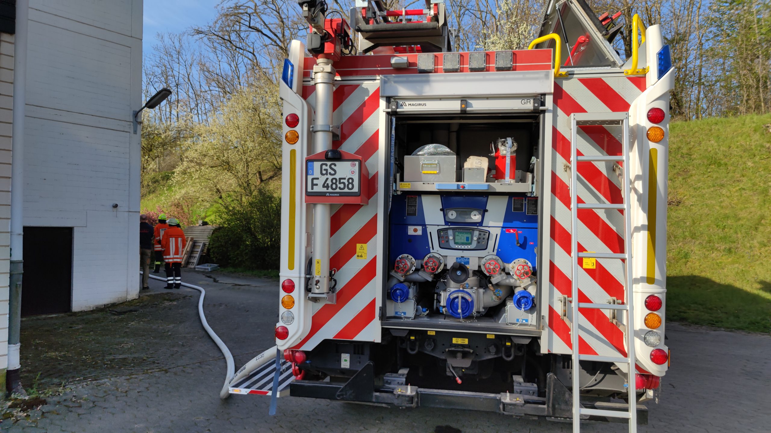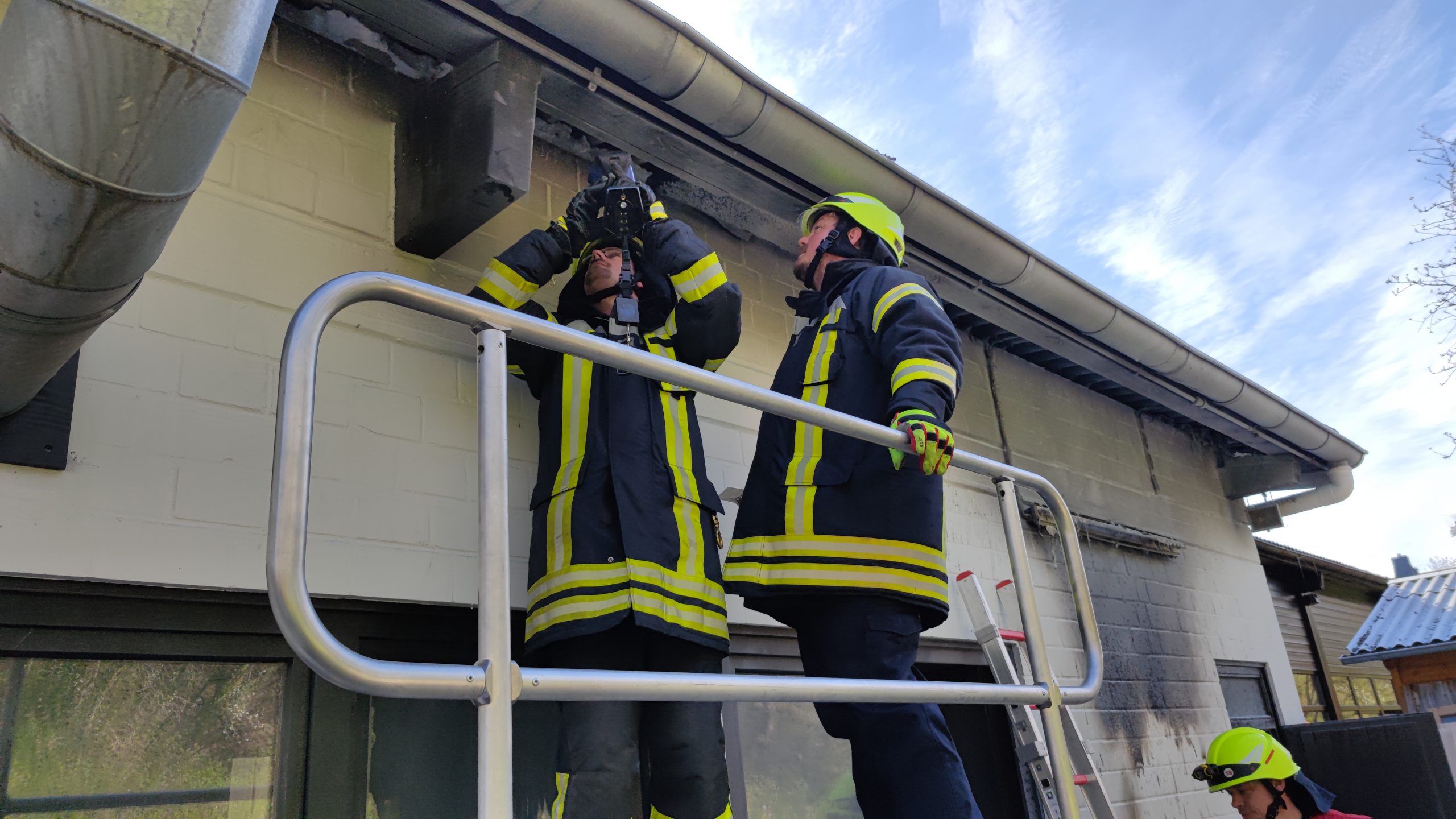 Bei der anschliessenden Kontrolle mit der Wärmebildkamera, gab es Temperaturen um die 300 Grad im Dachbereich. Teile der Dachverkleidung mussten entfernt und weiter auf ein Feuer kontrolliert werden. Vorsorglich wurde eine Wasserversorgung vom nächsten Hydranten zum HLF aufgebaut, um bei einer möglichen Brandausbreitung ausreichend Löschwasser zur Verfügung zu haben.