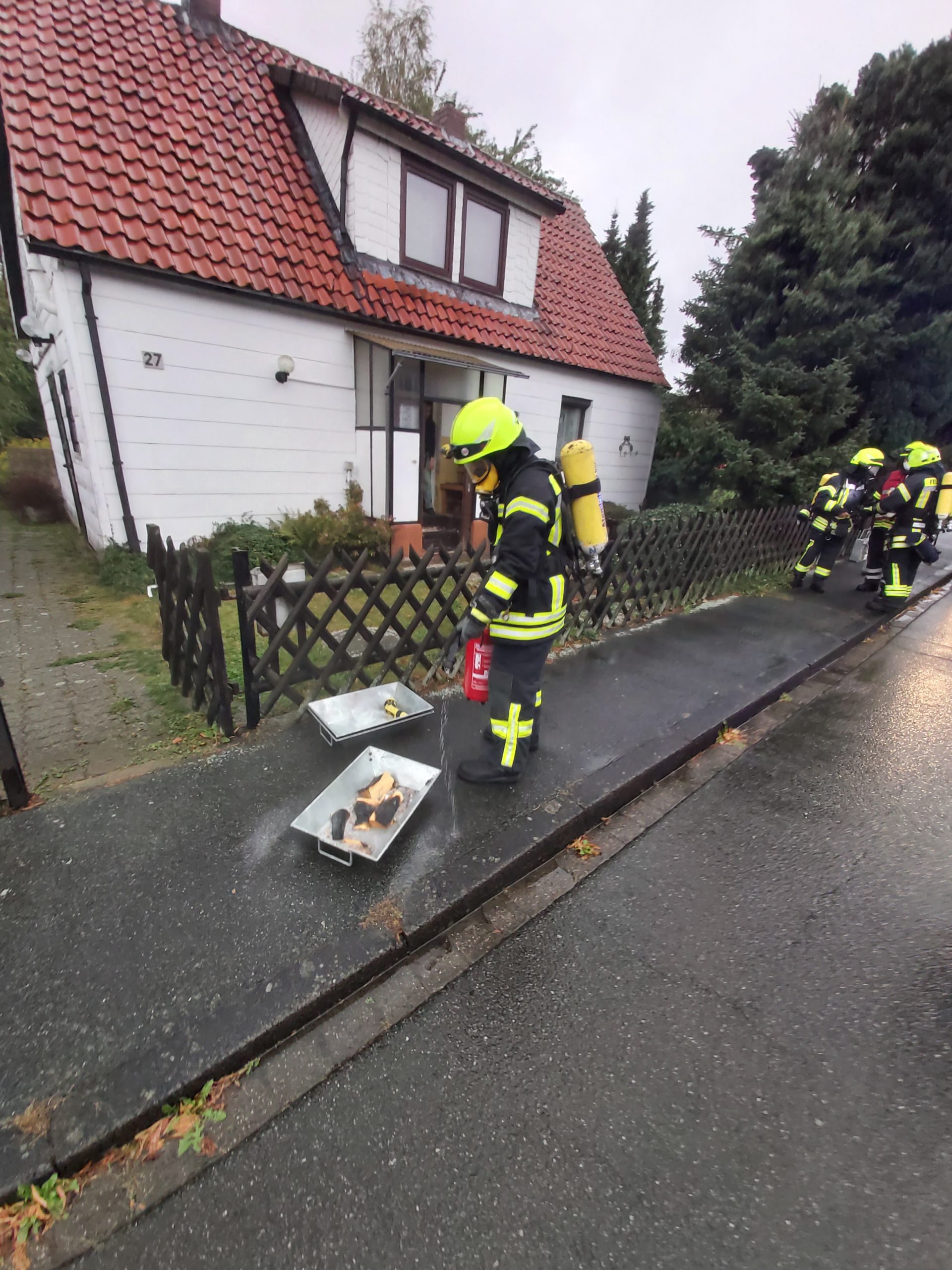 Der Angriffstrupp entfernte das entzündete Holz aus dem Kamin und verbrachte es in einer Schuttmulde nach draußen, wo es durch einen bereitstehenden Trupp mit Wasser abgelöscht wurde.