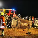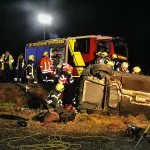 Ein Fahrzeug kam aus ungeklärter Ursache von der Straße ab, überschlug sich mehrfach und blieb auf der Seite im Straßengraben liegen. Die Beifahrerin war beim Eintreffen der Feuerwehr bereits von Ersthelfern aus dem Fahrzeug befreit worden. Die Fahrerin wurde in Absprache zwischen dem Rettungsdienst und der Feuerwehr schonend über das Heck aus dem PKW gerettet. Dabei kam schweres hydraulisches Rettungsgerät zum Einsatz. Beide Patienten wurden vor dem Abtransport in die jeweiligen Krankenhäuser vor Ort vom Rettungsdienst versorgt.