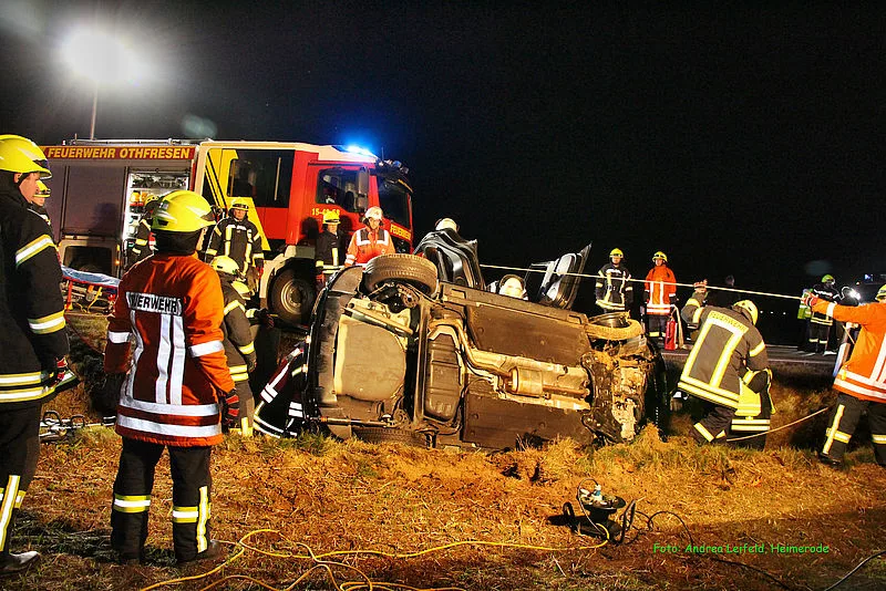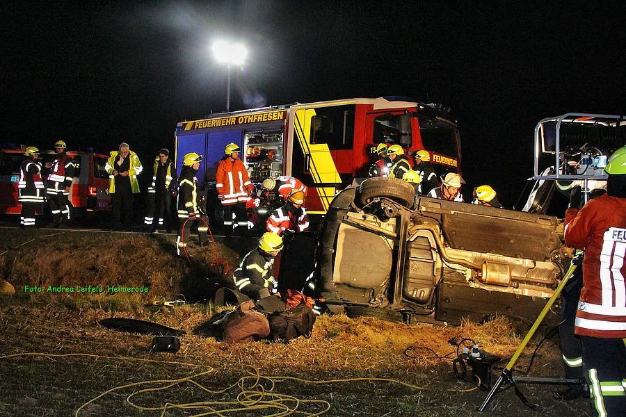 Ein Fahrzeug kam aus ungeklärter Ursache von der Straße ab, überschlug sich mehrfach und blieb auf der Seite im Straßengraben liegen. Die Beifahrerin war beim Eintreffen der Feuerwehr bereits von Ersthelfern aus dem Fahrzeug befreit worden. Die Fahrerin wurde in Absprache zwischen dem Rettungsdienst und der Feuerwehr schonend über das Heck aus dem PKW gerettet. Dabei kam schweres hydraulisches Rettungsgerät zum Einsatz. Beide Patienten wurden vor dem Abtransport in die jeweiligen Krankenhäuser vor Ort vom Rettungsdienst versorgt.