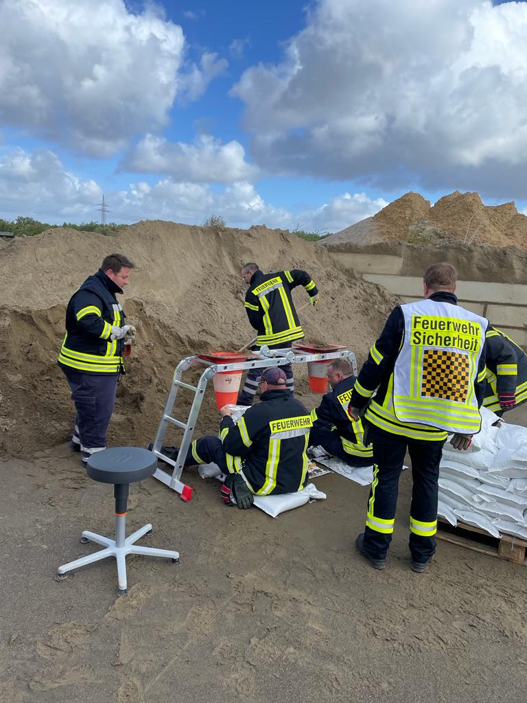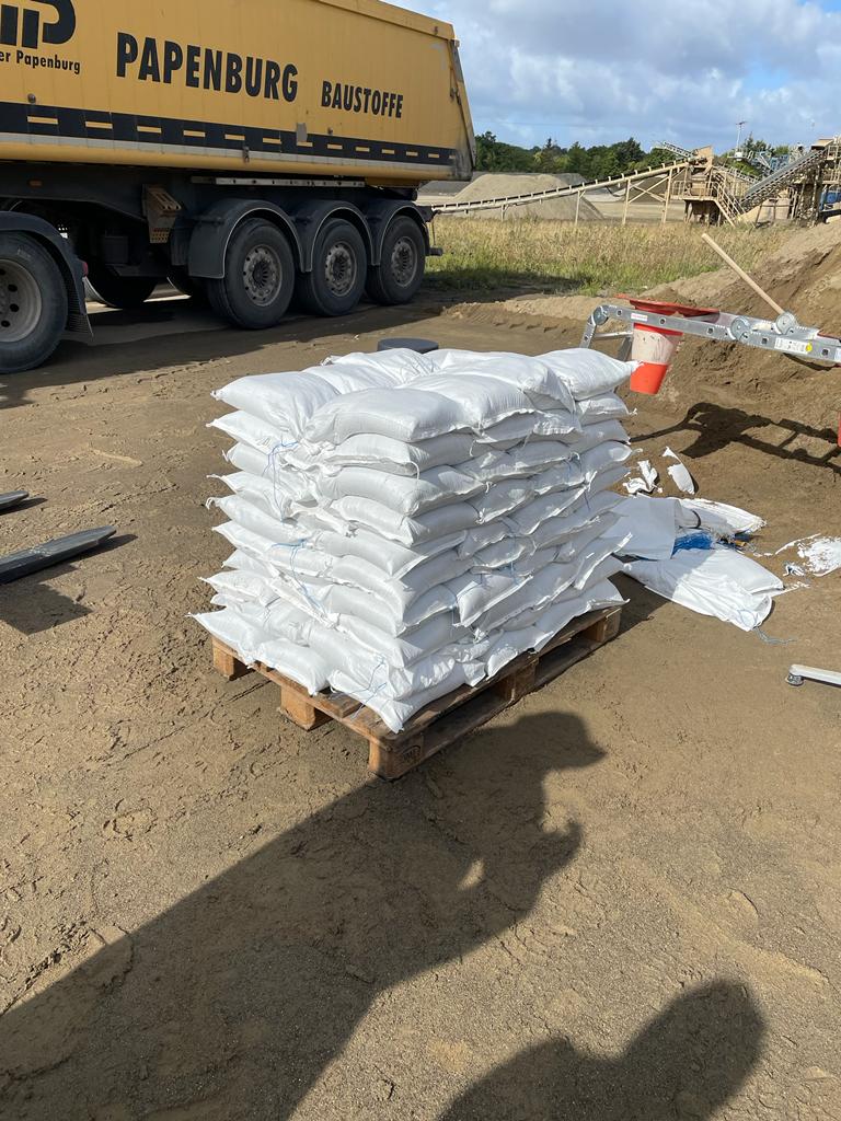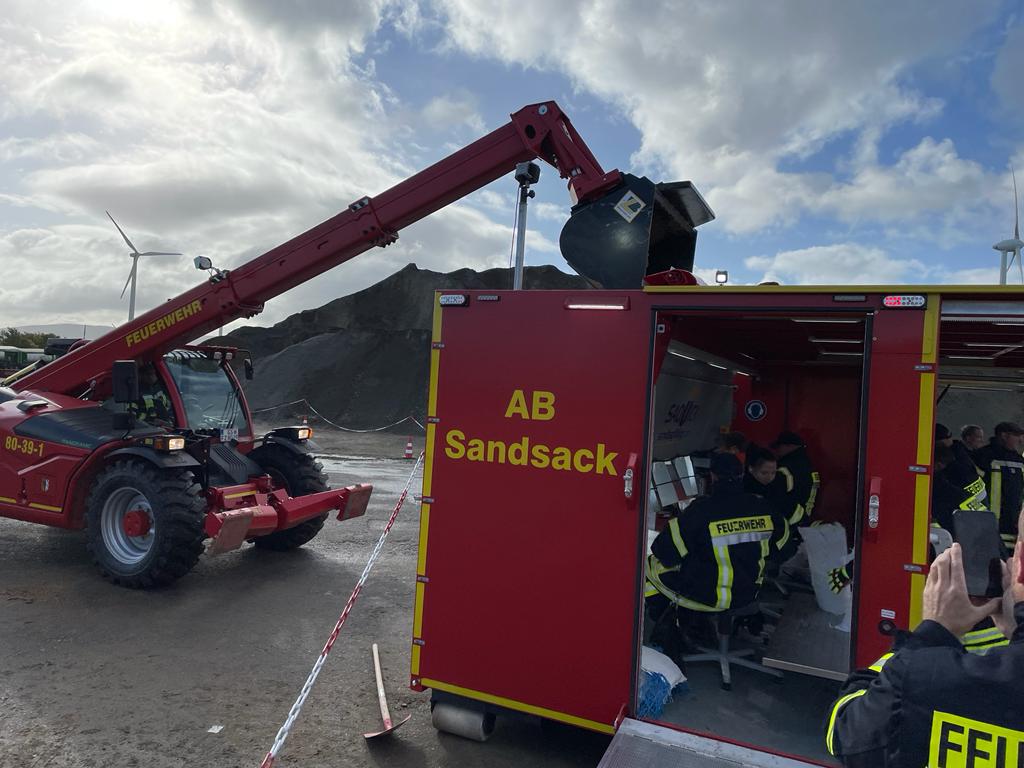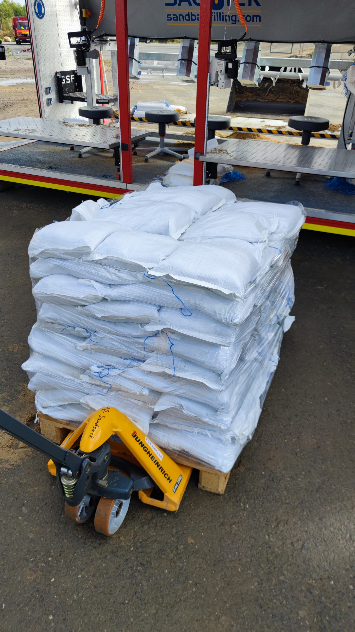 Als erstes wurden sämtliche Abläufe des Aufbaus und die Funktion der Sandsackfüllmaschine in Ruhe erklärt und Ideen oder Verbesserungen besprochen. Anschließend konnten die Kameraden an allen Positionen der Maschine üben . Angefangen mit dem Befüllen der Säcke und dem Vernähen. Eine neue Art der Palettierung wurde ebenfalls vorgestellt. Bei der Methode können pro Palette 90 Sack so gestapelt werden, dass sie rutschfest und sicher liegen. Das entspricht etwa einem Gewicht von einer Tonne.