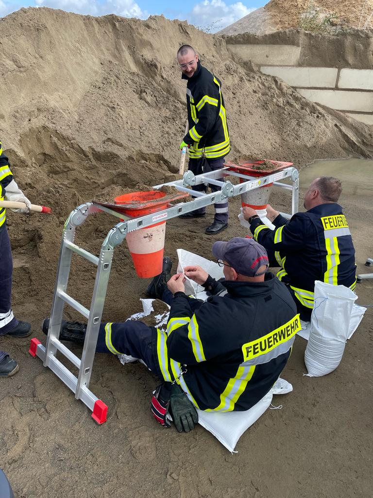 Zum Schluss wurde eine alternative Füllmethode vorgestellt, bei der die Sandsäcke mit Hilfe einer Leiter und Verkehrsleitkegeln befüllt werden.