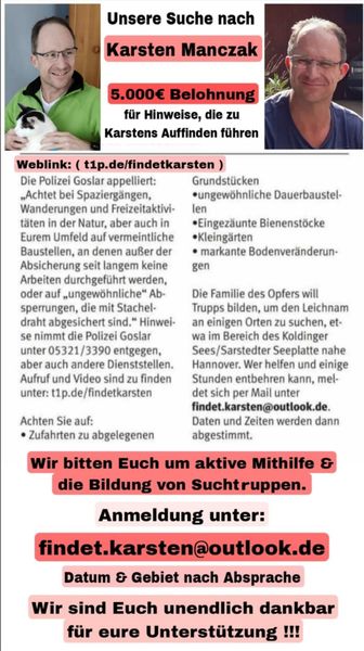 Wer sich gerne privat an weiteren Suchaktionen beteiligen möchte, kann sich weiterhin unter der Adresse findet.karsten@outlook.de anmelden.