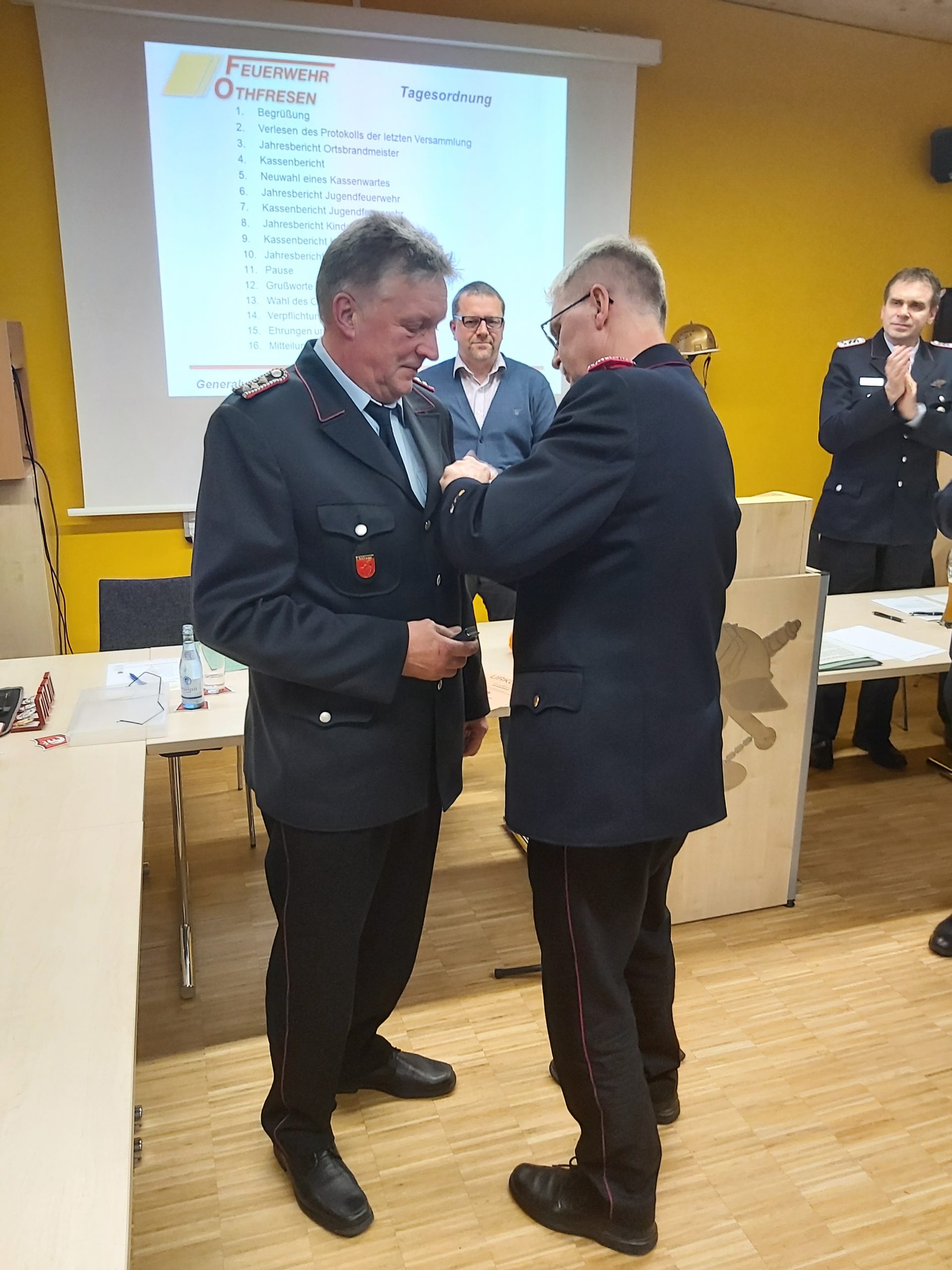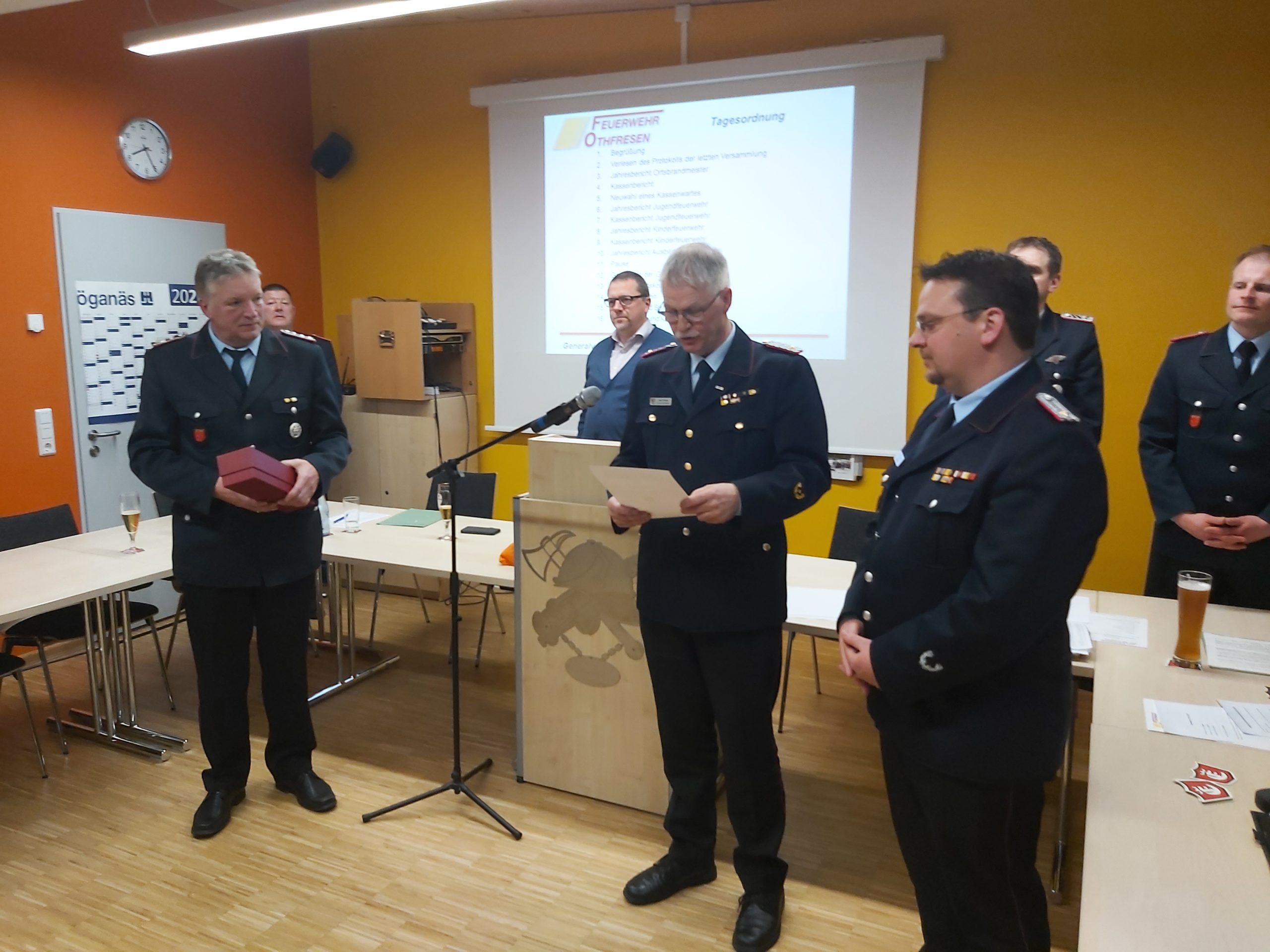Nach seinem Kassenbericht wurde der Kassenwart Gerhard Ehlers verabschiedet. Dieser gibt nach 23 Jahren sein Amt an den Nachfolger Markus Fricke ab. Für seine langjährige, hervorragende Arbeit, bekam der Kassenwart das Feuerwehrehrenzeichen in Bronze verliehen.