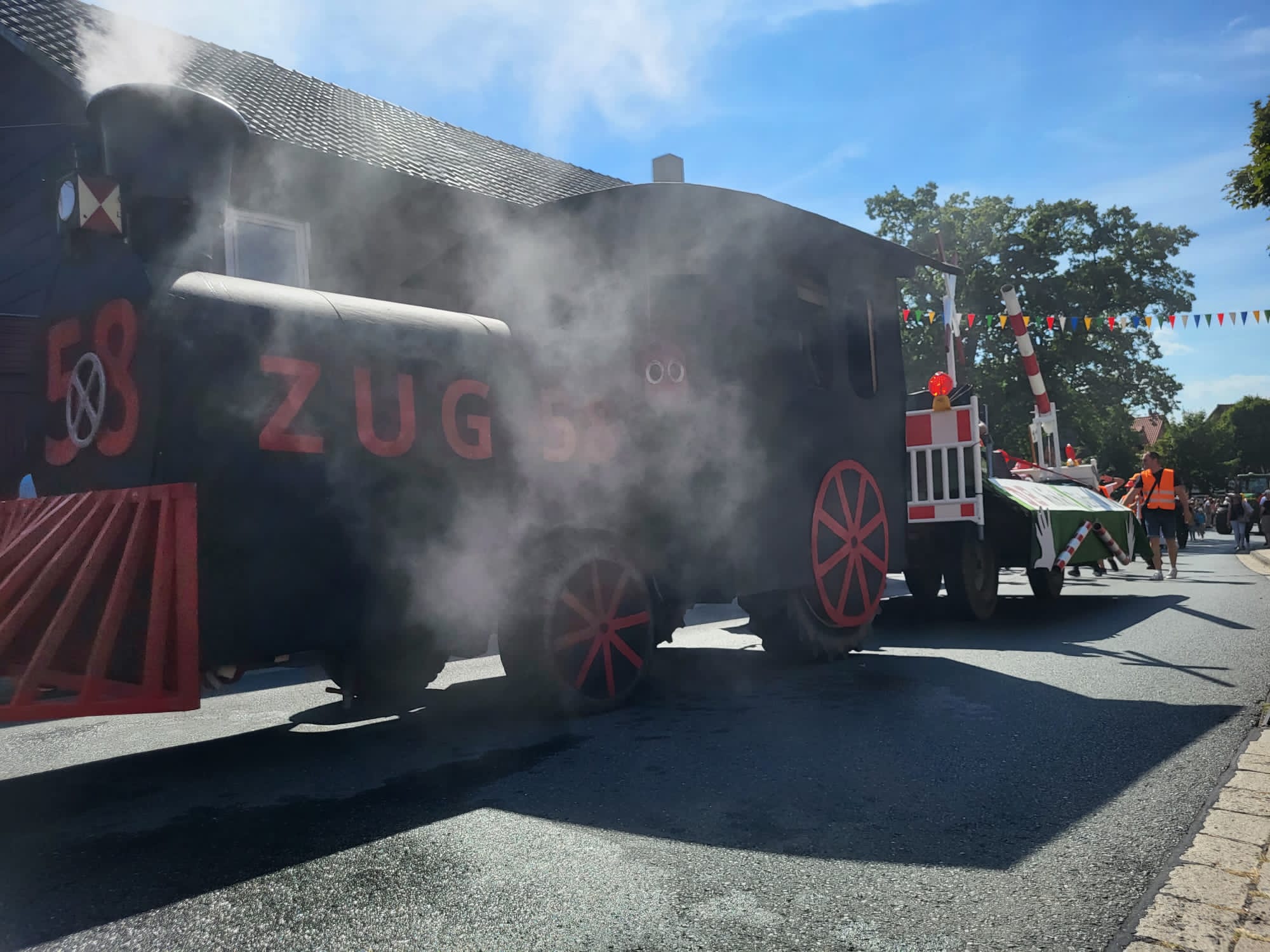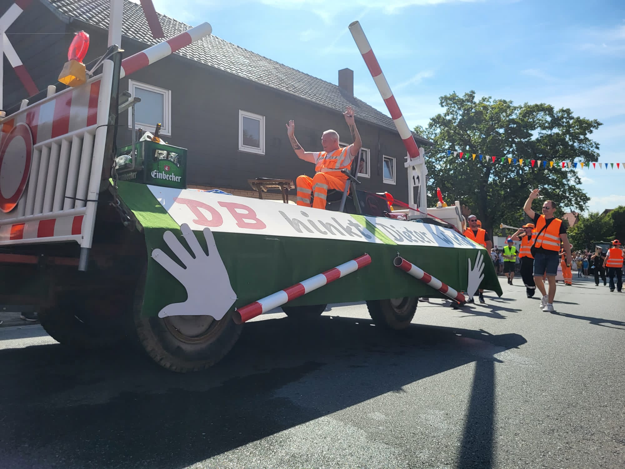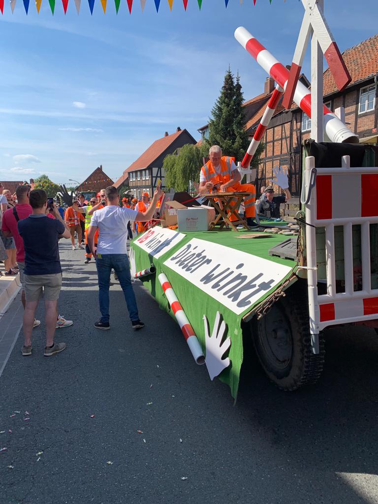Das alljährliche Highlight war natürlich wieder der Festumzug am Sonntag. Das diesjährige Motto lautete „Mund abputzen, weitermachen!“. Der Festwagen der Feuerwehr wurde von der Jury mit dem ersten Platz bei den Vereinen prämiert. Unser allseits bekannter, winkender Schrankenwärter Dieter vom Bahnübergang Heißum, der alltäglich den vorbeifahrenden Menschen ein Lächeln auf die Lippen zaubert, war auch hier der Star des Tages. „Die DB hinkt, Dieter winkt“ war am Wagen zu lesen, von dem Dieter zahlreiche Autogramm- und Selfie Wünsche zu erfüllen hatte. Ein toller Spaß, den er hier mitgemacht hat. Aber auch alle anderen Umzugwagen waren superkreativ und liebevoll hergerichtet. Ein echtes Highlight im Nordharz!