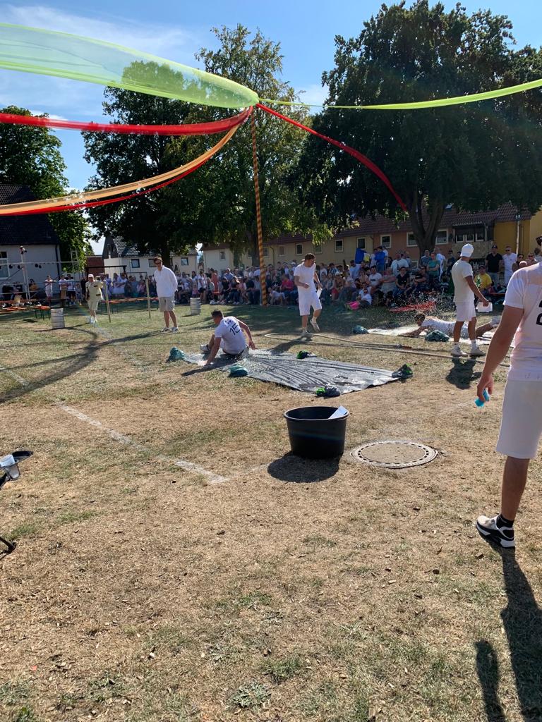Auch am Samstag war die Feuerwehr beim Spiel ohne Grenzen vertreten. Der Festausschuss hatte sich großartige Spiele mit dem Motto „Weiß kommen, bunt gehen“ ausgedacht. Im Stile eines Holi-Festivals war dann das Motto auch schnell in die Tat umgesetzt. Der Platz im Mittelfeld tat dem Spaß und der Gemeinschaft keinerlei Abbruch.